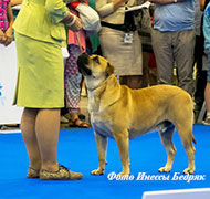Описание: (часть описания непонятно написана), породная голова, сильные челюсти, хорошо развитые клыки, достаточно мужественное выражение, отличной формы грудь.